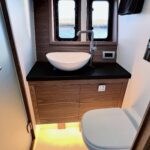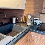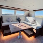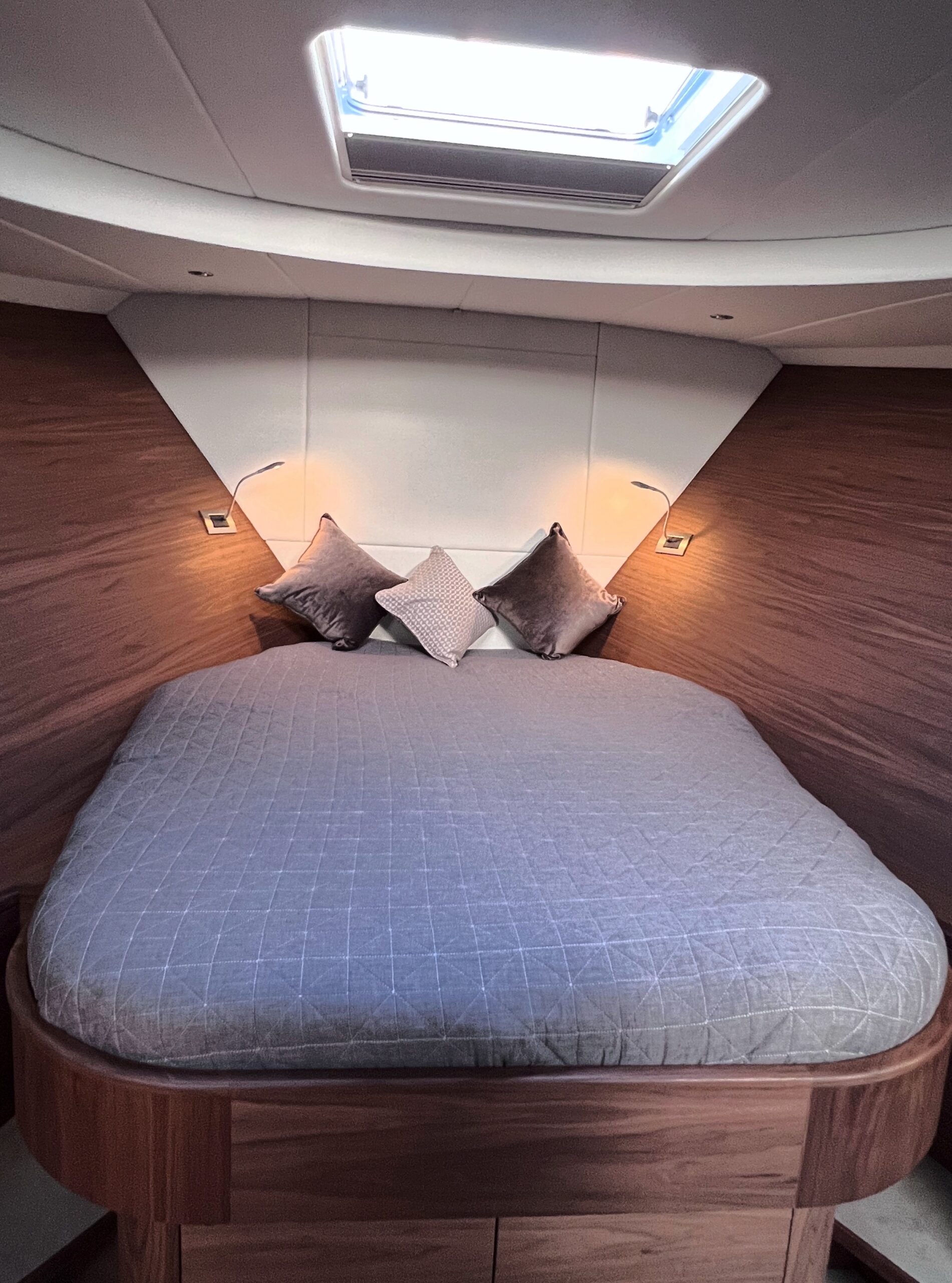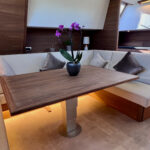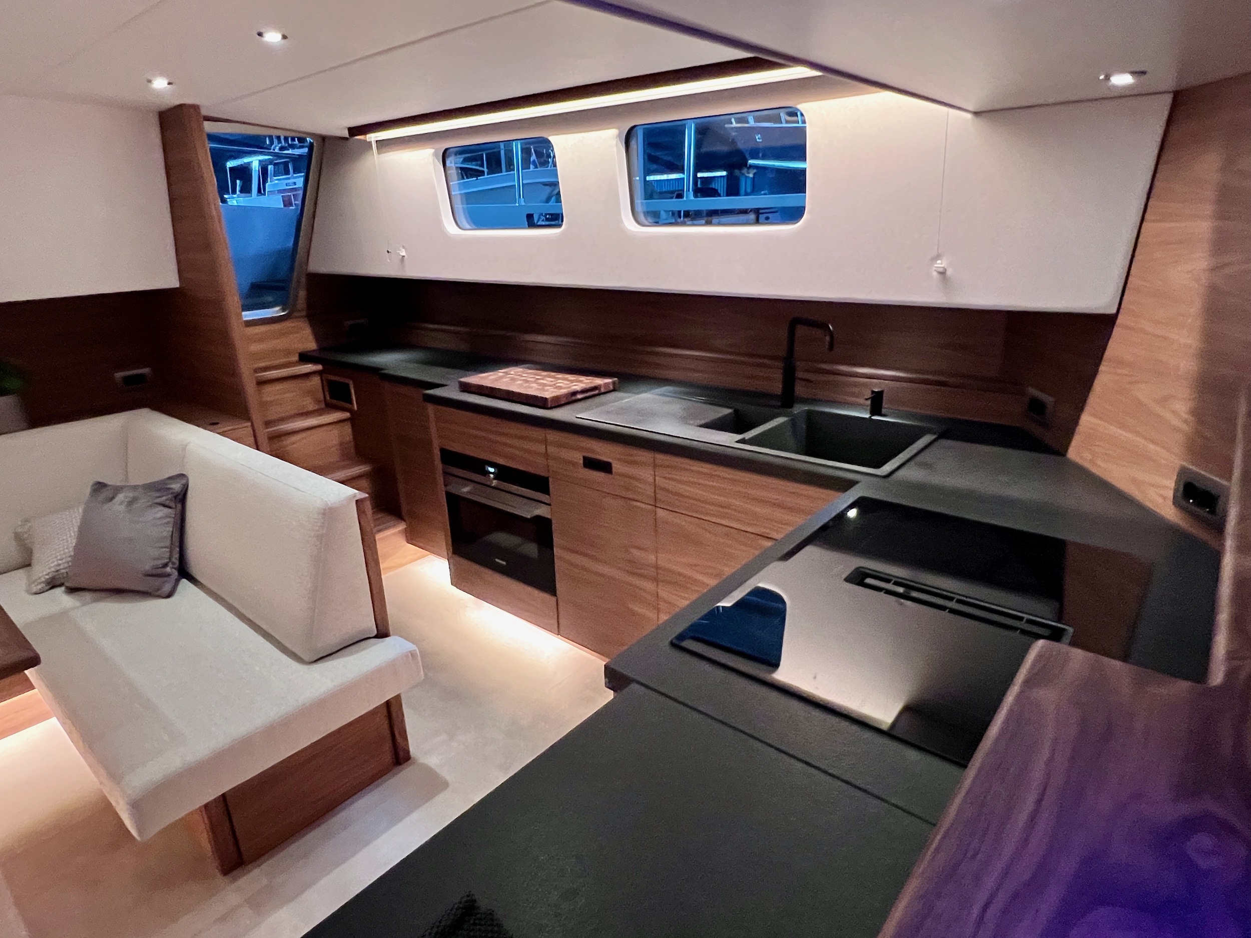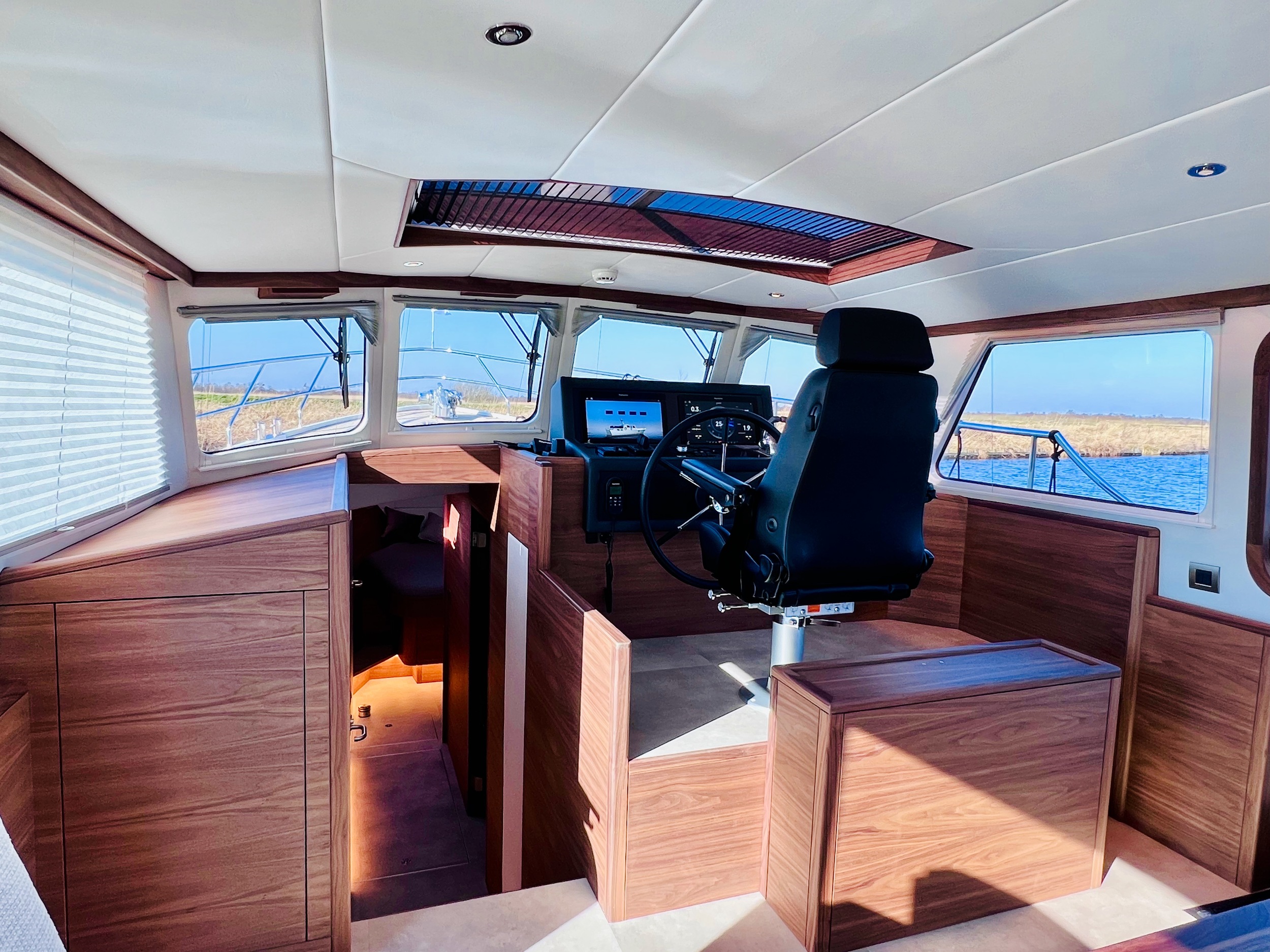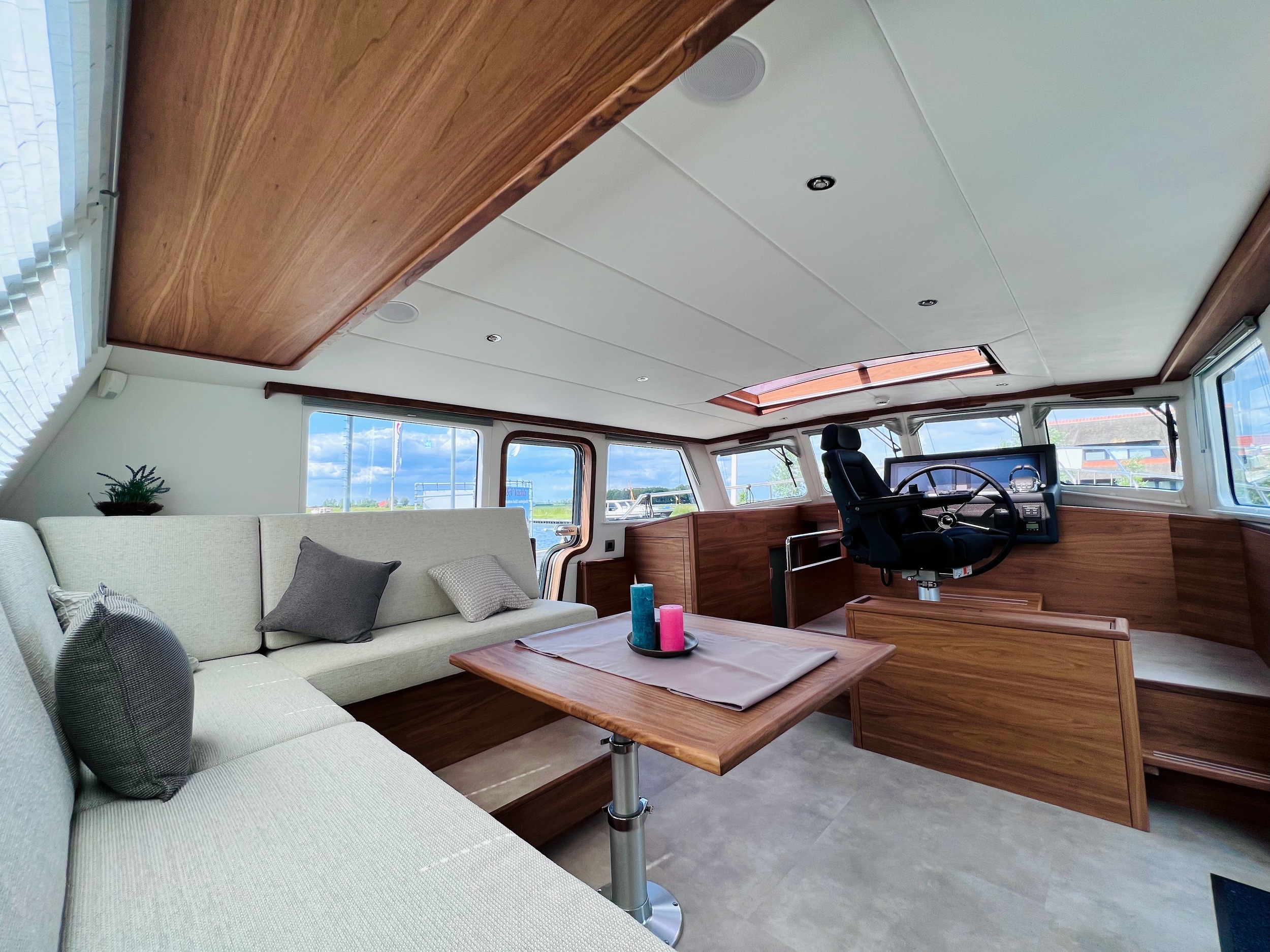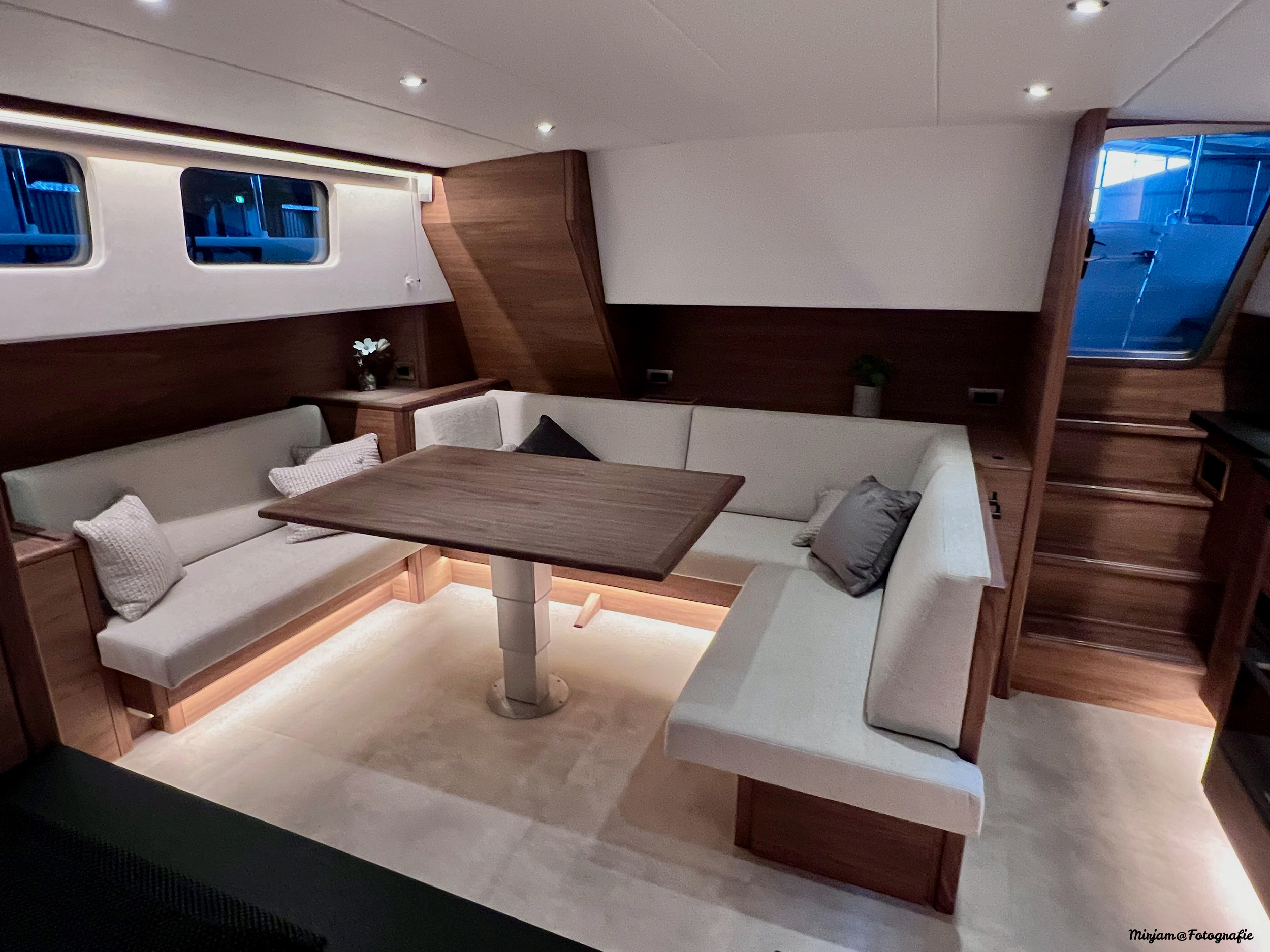 The interior is spacious, playful and very comfortable, not in the least due to a great deal of attention to ergonomics. There is a lot of workspace and a long ship’s kitchen with an exceptionally long worktop and views to all sides. There are ample opportunities to sit and lie down, the ship has good walking routes and also a lot of privacy without losing the feeling of space.