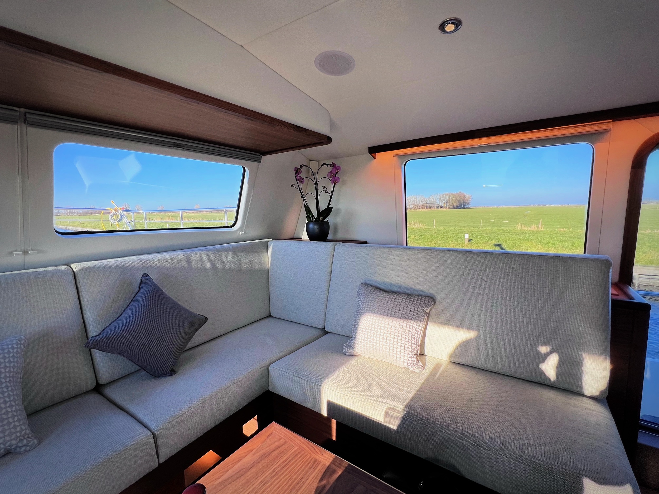 De volledige stalen rondspant heeft vloeiende lijnen en is uitermate stabiel. Een bijzonder kenmerk is de geringe doorvaarthoogte en minimale diepgang waarmee u veilig wat meer avontuurlijke waterwegen kunt kiezen. De brede gangboorden zijn op gelijke hoogte van het stuurhuisvloer, daar vindt u een verhoogde duobank en een zorgvuldig vormgegeven stuurhuispet voor optimaal 360 graden panoramisch zicht. Dit 15 meter lange schip biedt door het unieke split-level systeem dezelfde ruimte als een gelijkwaardig schip van 17 meter.